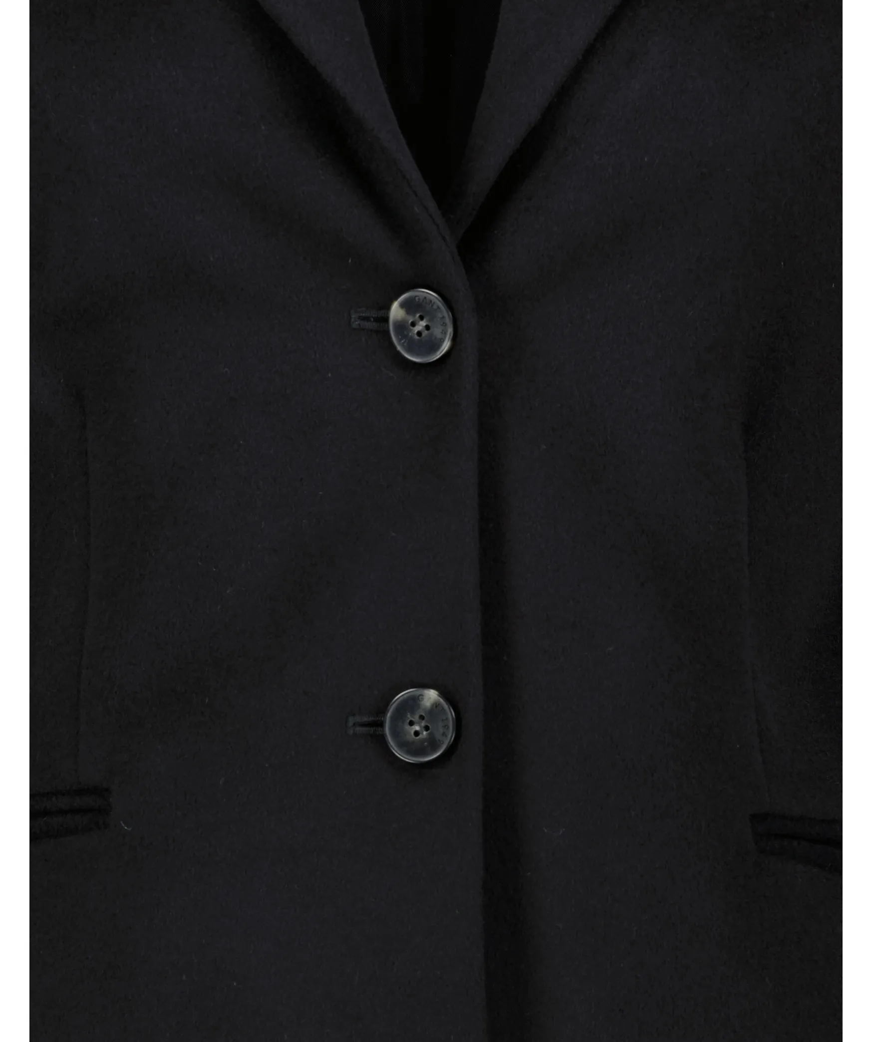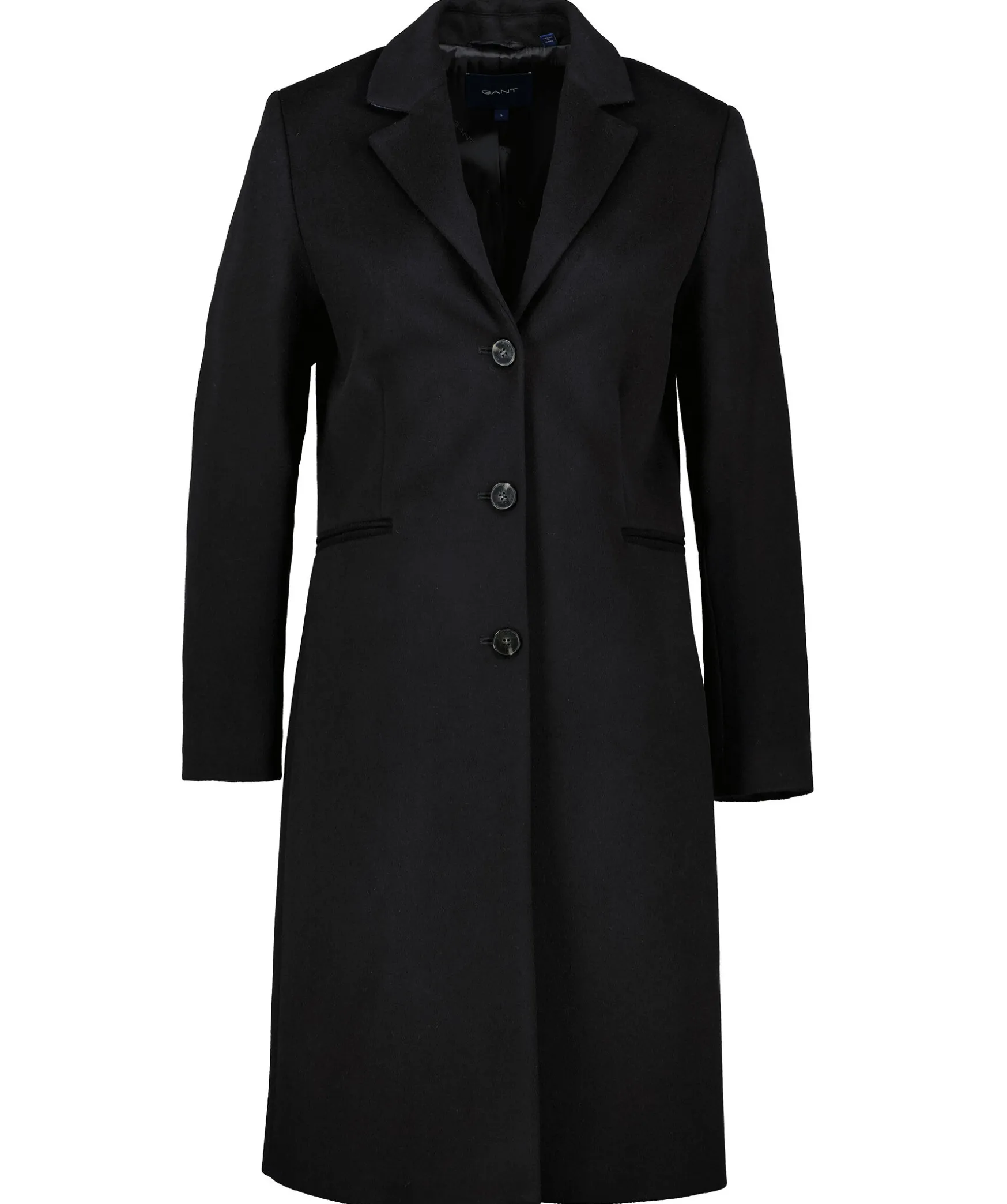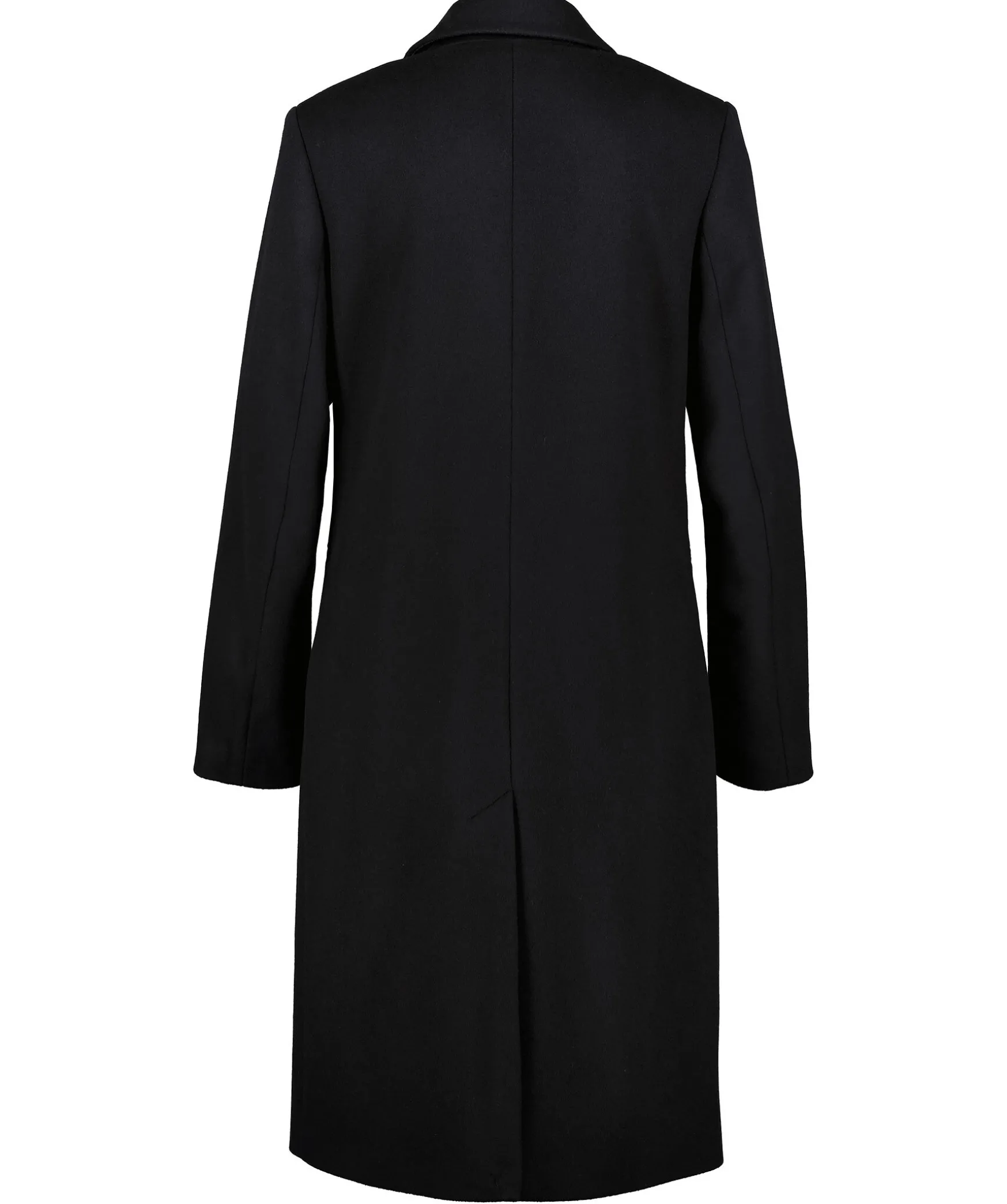 Svart Ullkappa Fran Gant. Tva Fickor Fram, Klassisk Krage, Slits Bak Och Blatt Foder. Tillverkad I En Ullmix.