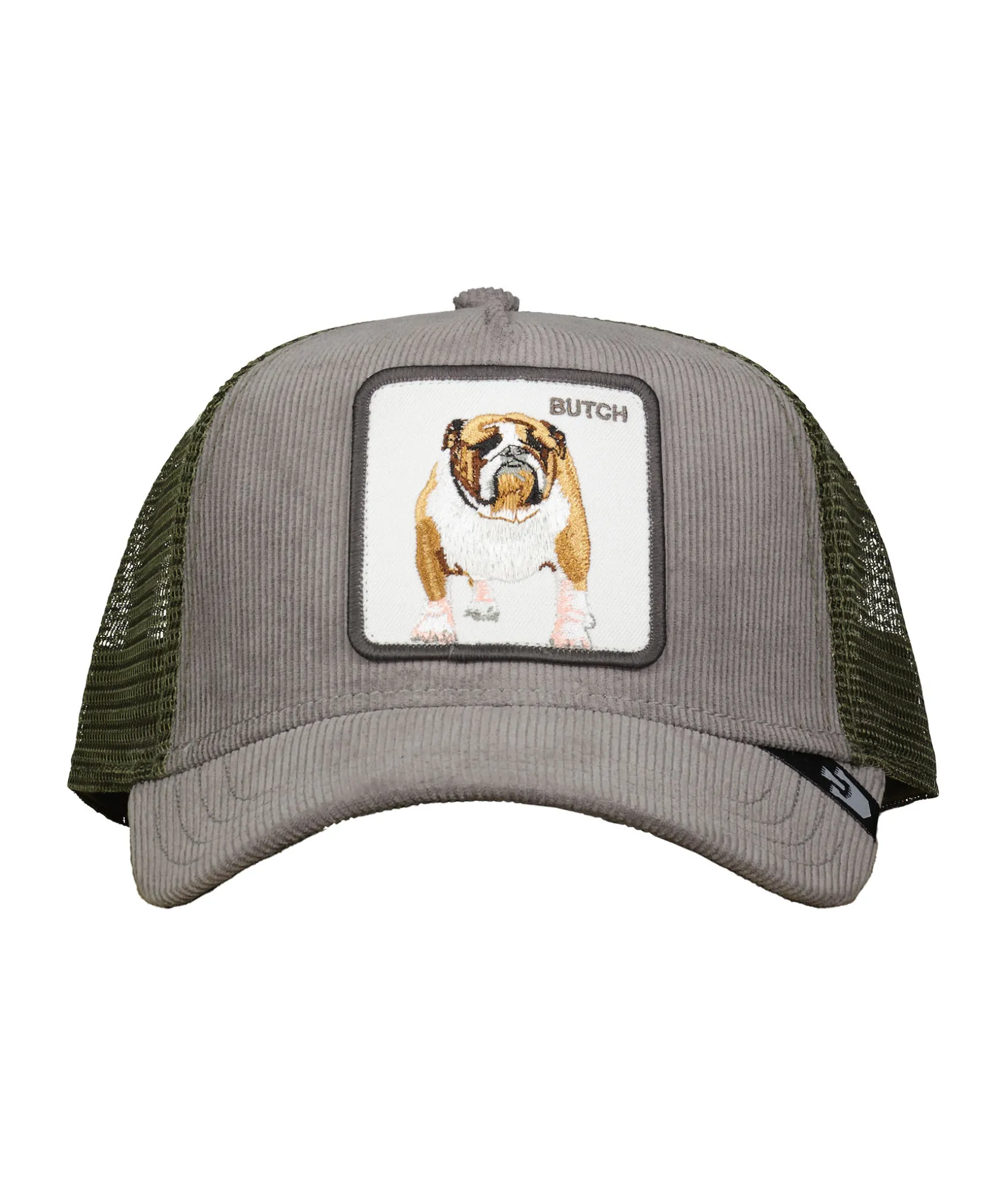 Gra Och Gron Keps I Trucker-Basebollmodell Med Fyrkantig Patch Med En Bulldog Hund Och Texten ”Butch” Framtill Fran Goorin Bros. Framsida Av Kepsen Har Gratt Manschestertyg. Gront Meshtyg Baktill. Onesize Modell Med Ett Justerbart 4-Snap-In-Rem.